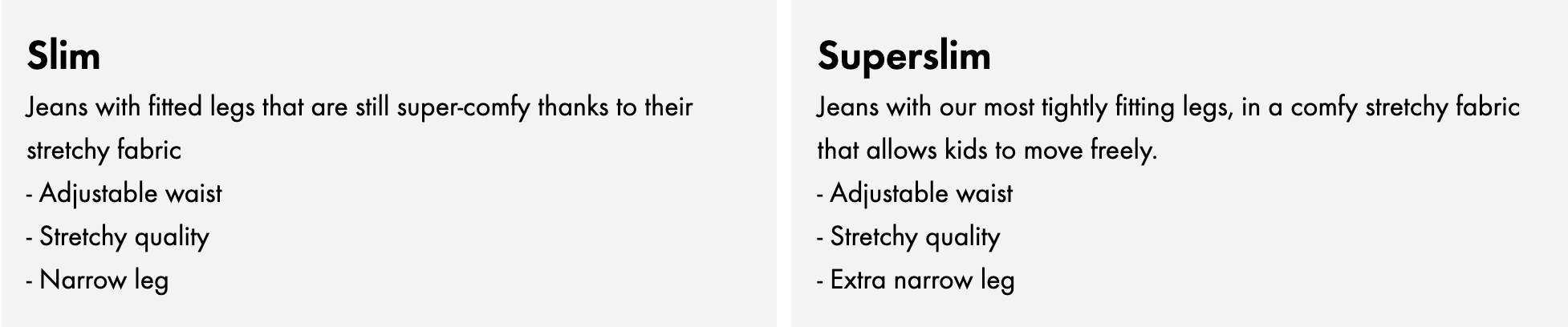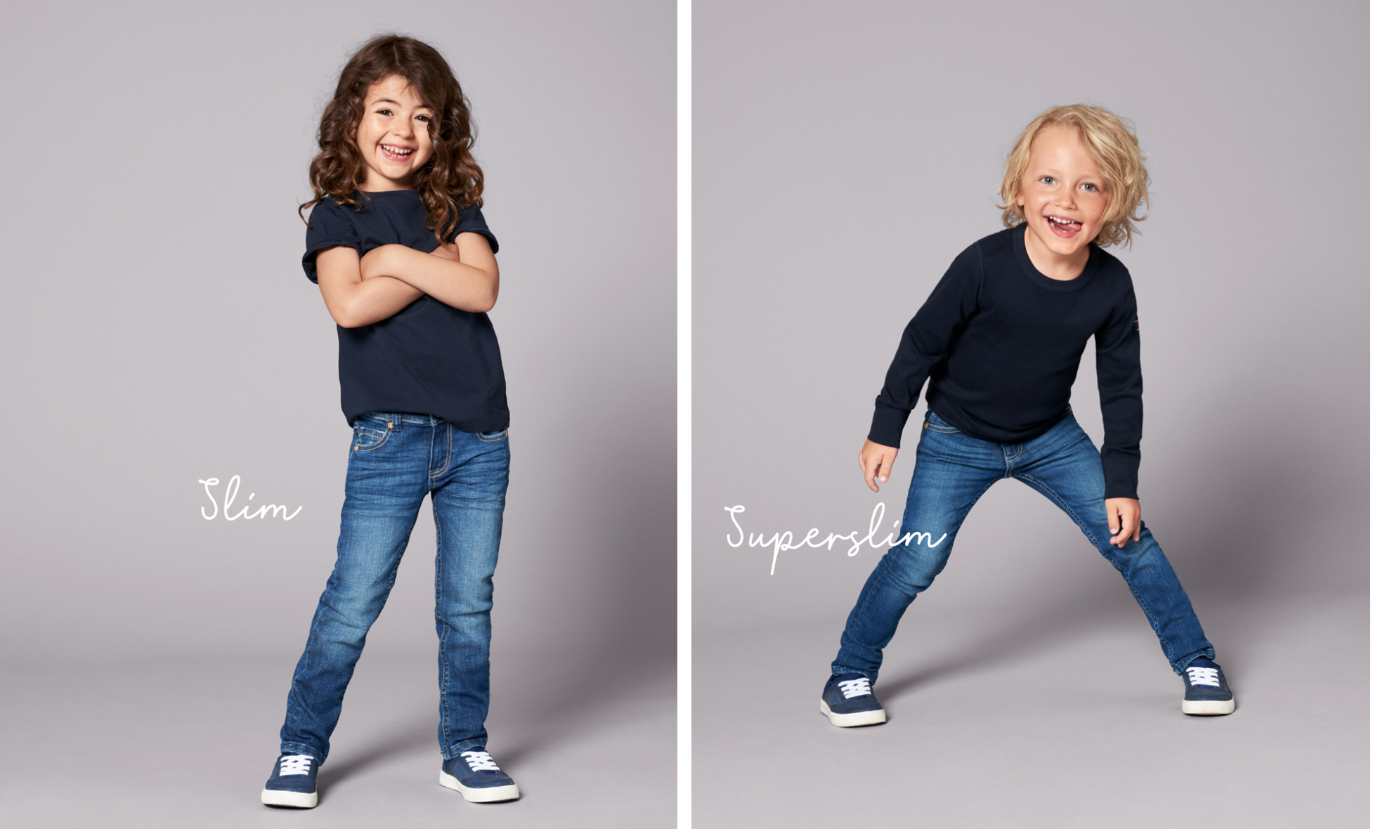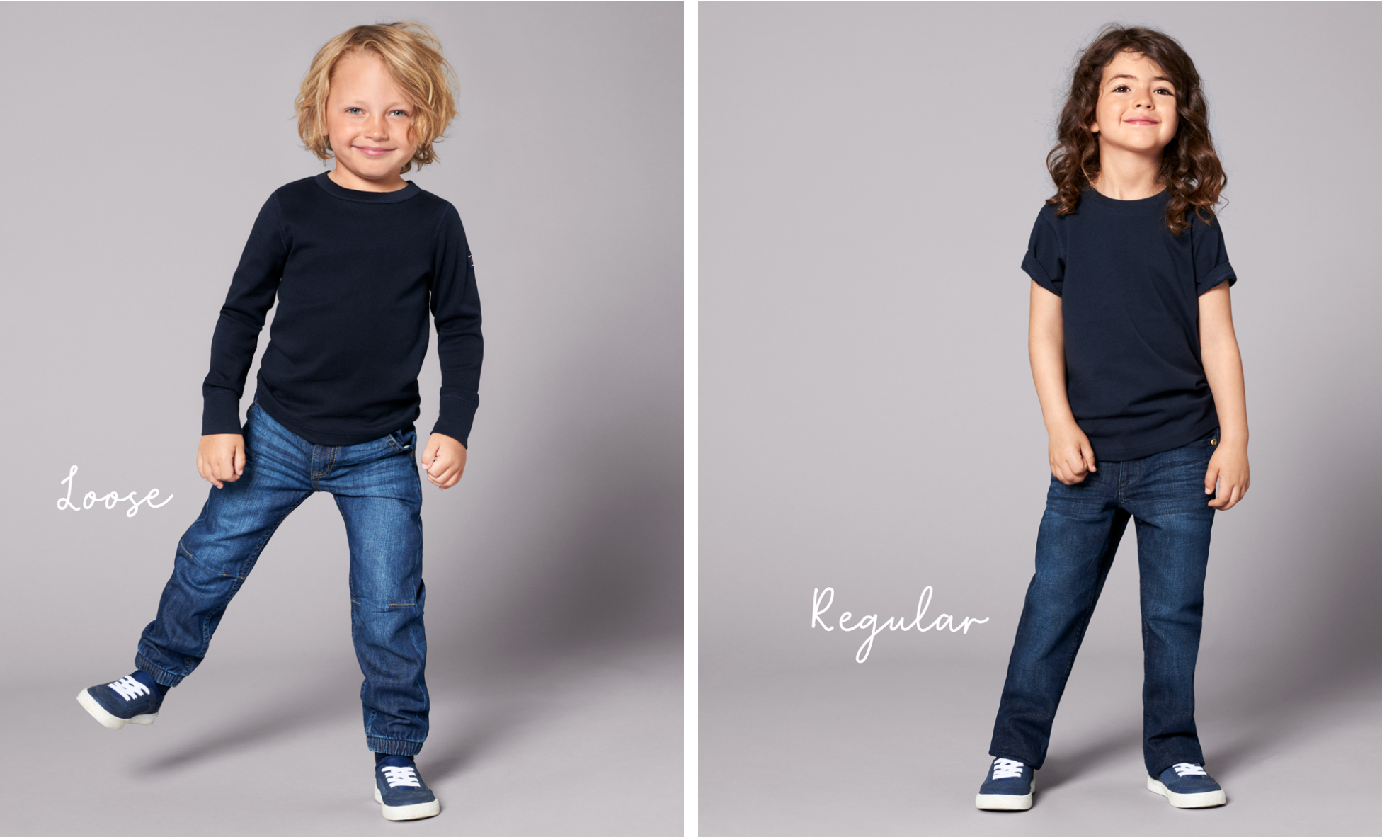 Our jeans come in four different fits. Each fit is available in various washes, wear effects and colours for each season, so that every child can find their perfect jeans!