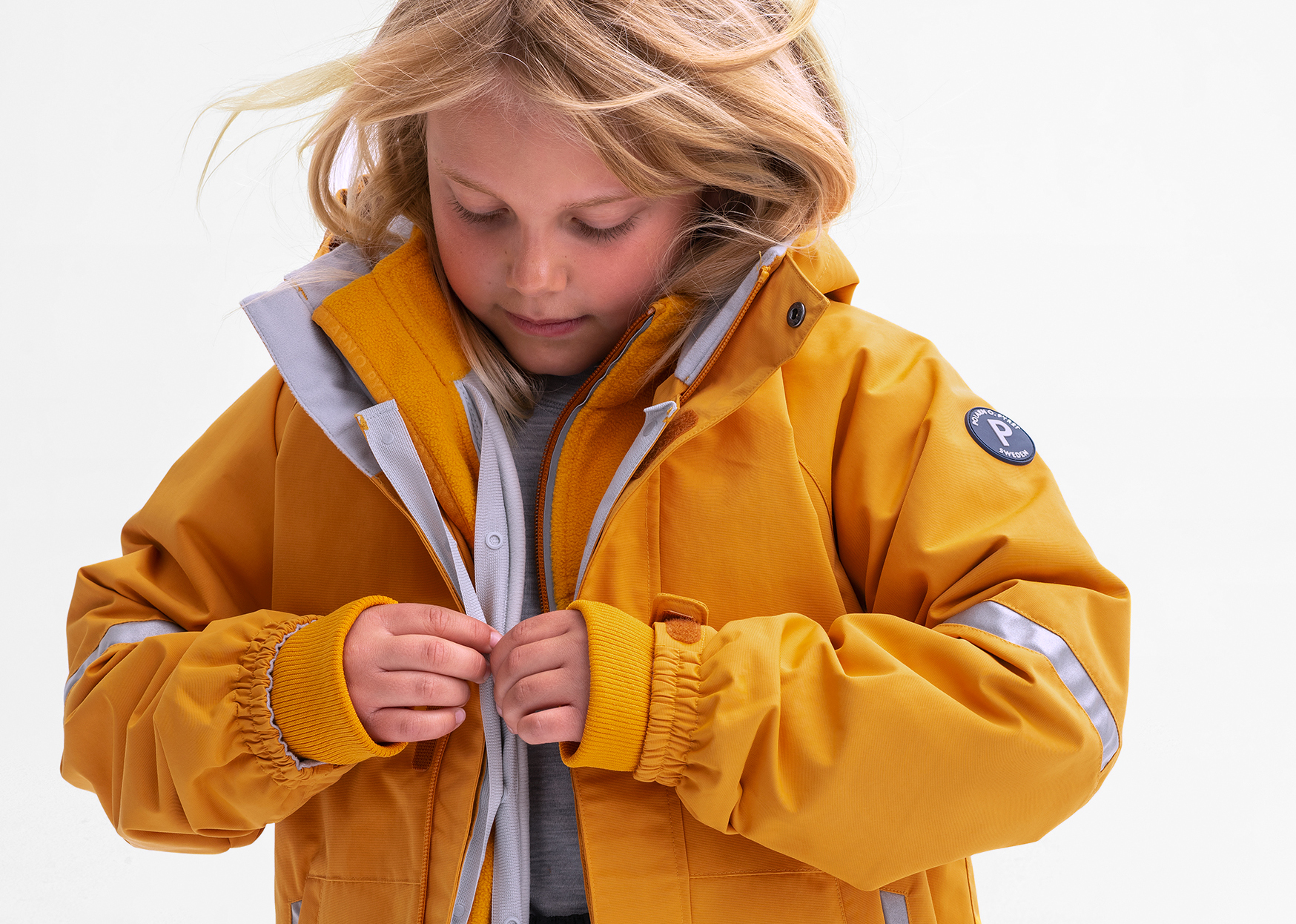 Layer 3 must satisfy many criteria: it should be durable yet still flexible enough to play in. It should wick away moisture from the body, but not let in water and wind from the outside. And it should have 360-degree reflectors to ensure your child is visible in all kinds of weather and from all angles. Just for starters. Check out the descriptions of our Layer 3 products to see all their functions and characteristics.