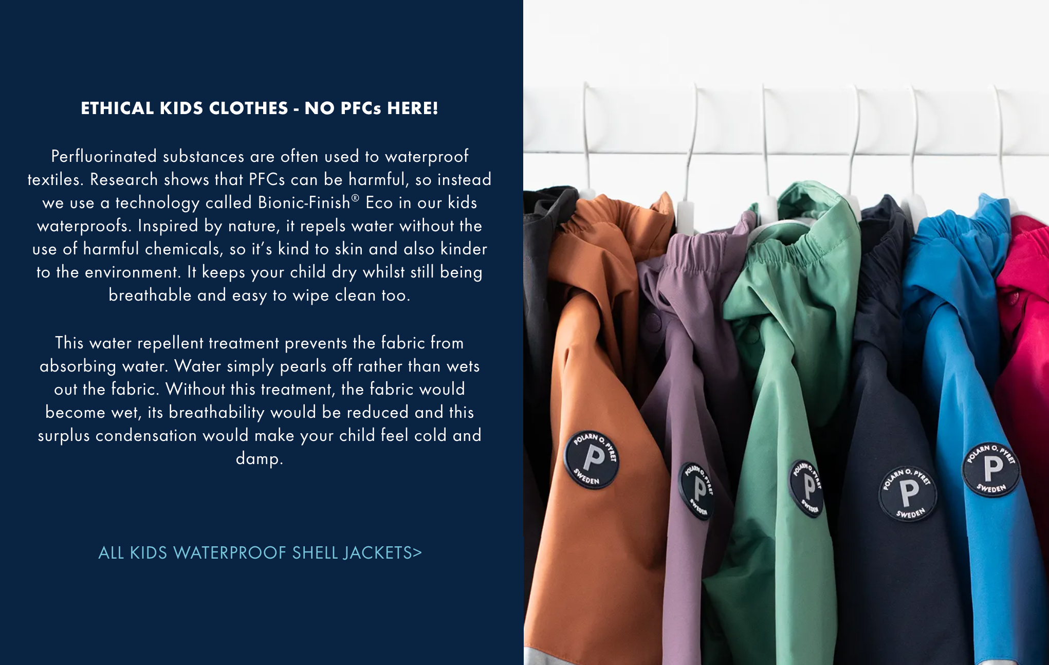 When it comes to outdoor play, Polarn O. Pyret is an expert at ensuring your child has the perfect, functional outerwear for any weather conditions Our kids' waterproof gear is lightweight, flexible and extra durable in all of the right places - because bad weather shouldn't stop the fun for your little ones.